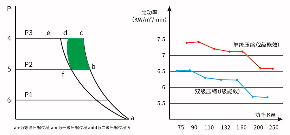 空气经过一级压缩后,通过强化喷油冷却,降低二级空气温度,空气进行等压缩,降低压缩功率。两级压缩采用等压比来设定级间压力,故每级压缩比都要比单级压缩比降低很多,转子之间的回流泄露量大大降低了,容积效率和绝热效率得到了大大提高,相应的提升了压缩的产气量。在相同的功率下两级压缩比单级压缩产气量高,可实现更好的节能效果。