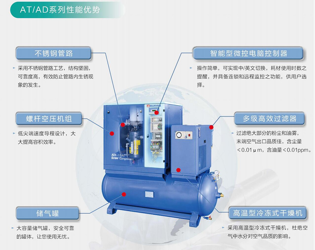 4. AD系列11kW(含)以下使用450L储气罐,11kW以上使用500L储气罐。