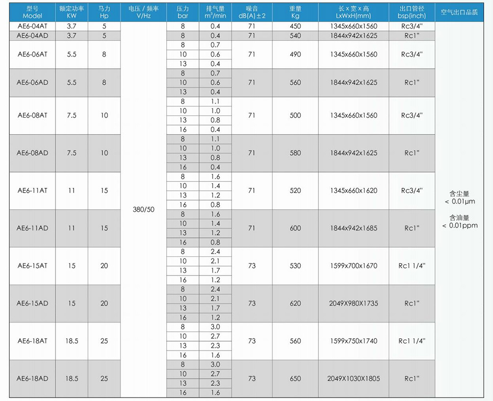 3. AT系列11kW(含)以下使用300L储气罐,11kW以上使用370L储气罐。